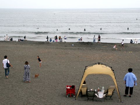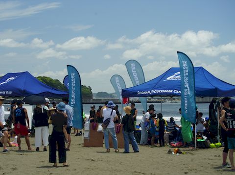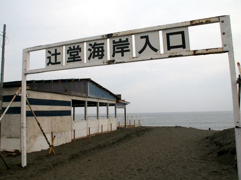 辻堂海岸海の家、看板も出来た土曜日とあって子供連れの家族の姿が目立つ辻堂海岸、良く見かける結婚式の前撮りの人もいた。 |