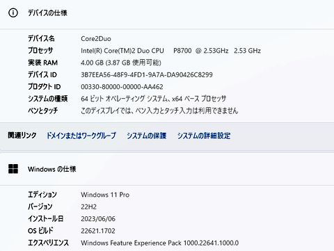 Core2Duo機にWindows11をインストールCPUが2コア(必要条件は4コア)、TPM無しが不足条件だが、レジストリを細工する方法で無理やりにインストールした。 |