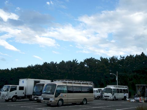 公園駐車場にはロケバスや機材トラック多数この海岸は、平日なら人が少ない、駐車場が利用しやすく海岸に近いとロケの撮影には最適なよう。 |