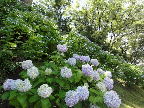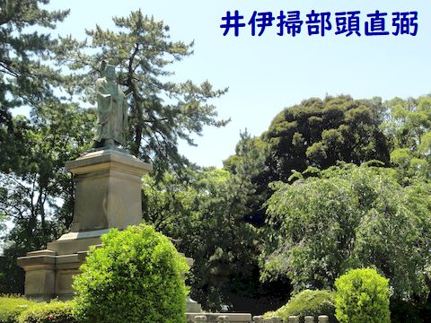 掃部山公園にも紫陽花昼食後、県立音楽堂に移動、待ち時間が長いので隣の掃部山公園で休憩。 井伊直弼は横浜を開港し現在の繁栄に繋がった貢献度を評価され、丘の上に衣冠束帯の姿で港を見て立っている。 |