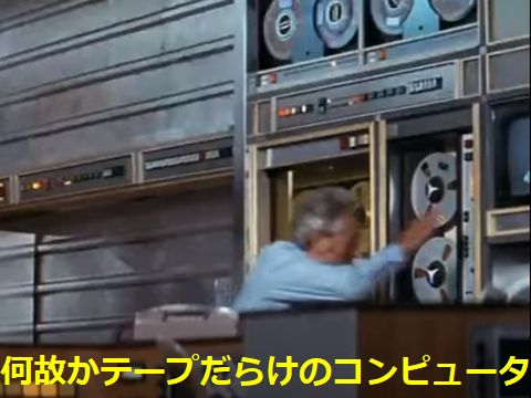 ロケット発射のコンピュータはテープ記憶打ち上げプログラムはなぜかカセットテープに入れてあり、ボンドがすり替えるという話。テープマシンが何台も 並んで動いているのは当時のコンピュータの代表的なイメージかな。 |