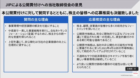 東芝経営陣がTOB推奨のコメント「これ以上TOB価格が上がる見込みない」から株主にTOB推奨って経営陣の無能さを証明しているだけ?としか思えず。 これまでTOB価格を上げるために一体何の努力をしてきたのか、と疑問だらけ。単に時間稼ぎしただけにしか見えない。 |