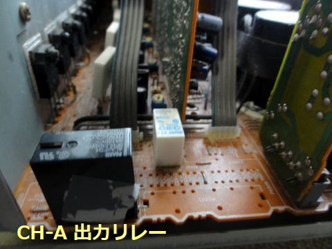 出力リレー部:リレー3個使用このリレーはPANASONIC製だがもう廃番で高価になっているため交換はしない(ヤフオクあたりで1個1000円もする)。 今の所、同じリレーを使っているB−CHは正常動作なので現状でも継続使用は可能。 |