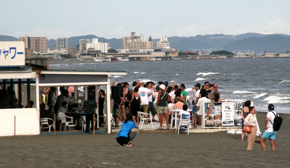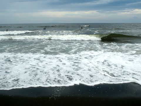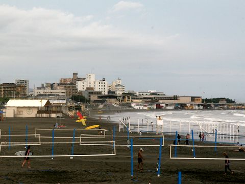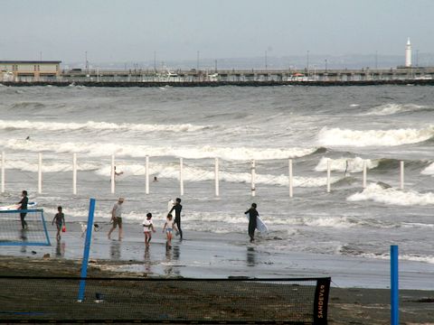 鵠沼海岸は人が多い白い杭の向こうは海水浴場、手前にはビーチバレーのコート。 満潮時間か潮位が高く防潮堤を乗り越えて押し寄せている。 |