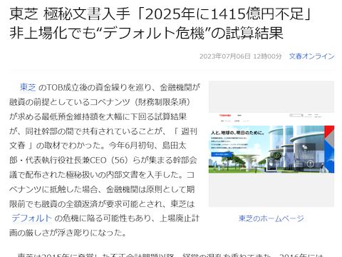 東芝は預金不足でデフォルト予想、これ陰謀?社内幹部に配布された資料が出てくる不思議さいっぱいな状況、これってTOBに応じない株主に売却 の後押しする深慮・遠謀、それとも陰謀? |