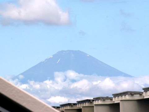 朝の富士山、雪はほぼ消えた昨日は富士山も山開きだったが午前中は荒天で7合目あたりで登山を中止した人も多かったよう。 |