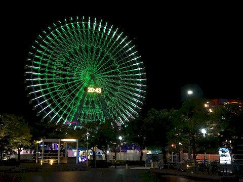夜のみなとみらい地区みなとみらいホールからの帰路、そとの海添いの道を歩いて駅へ、遊園地は終了時間。 |