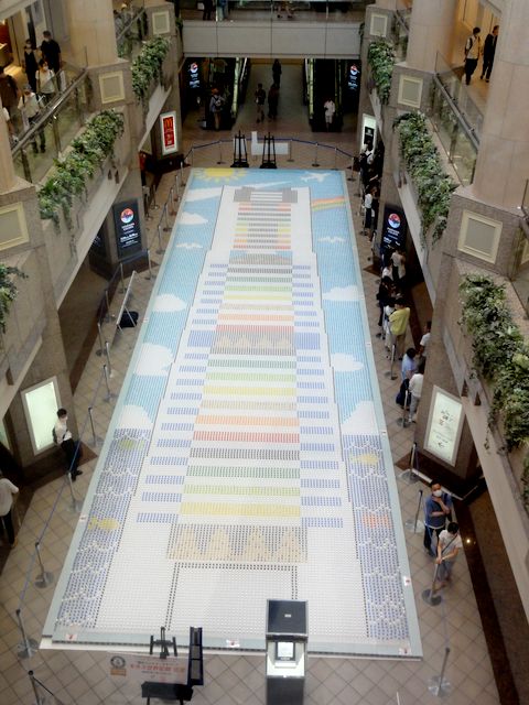 ランドマークタワー@ペットボトルで作ったモザイクこれがギネス記録認定のモザイクなのだそう。一体何個あるのだろう? |