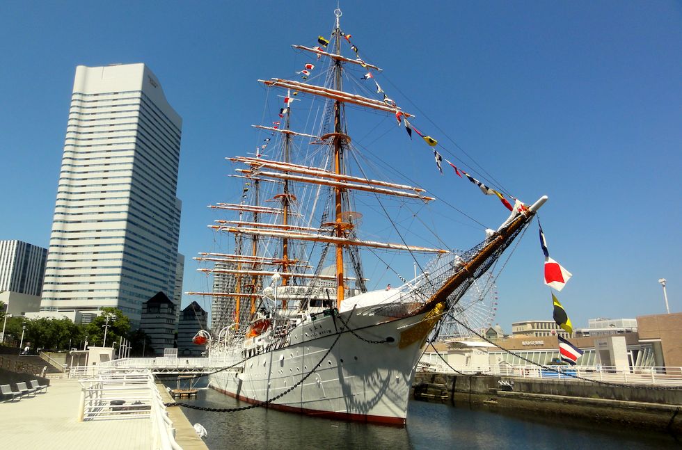 帆船日本丸は満艦飾に昨日は全部の帆を張るイベント、総帆展帆だったよう。 |