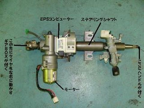 左は納入した製品が搭載されたスズキ・セルボ(三菱電機製と共に)、右は最近の軽自動車用電動パワステ の様子、コントローラは大幅小型化(当時計画した第2世代にほぼ同じ)しコラムに一体化取付。 現在は光洋精工の合併会社JTEKTが国内シェア70%だとか。コントローラは三菱電機、OMRONなどあり。 |