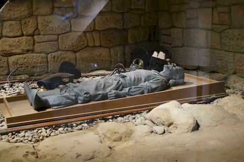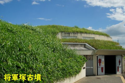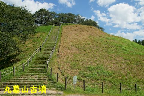 さきたま古墳群9時24分のバスで前玉神社前へ移動、先週のブラタモリの最初に出てきた場所。歩いて古墳群を順に観て回る。 まずは二子山古墳の横を通り、将軍塚古墳の展示館へ埋葬されていた状態を展示している。 暑いので丸墓山古墳の上まで歩いて上がるのは断念。 |