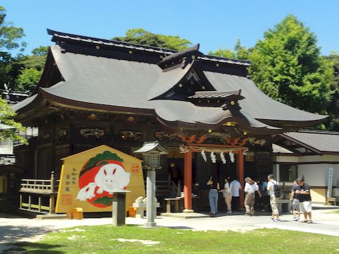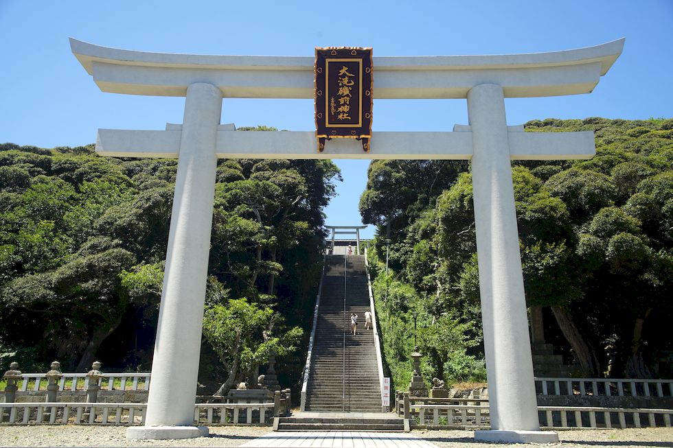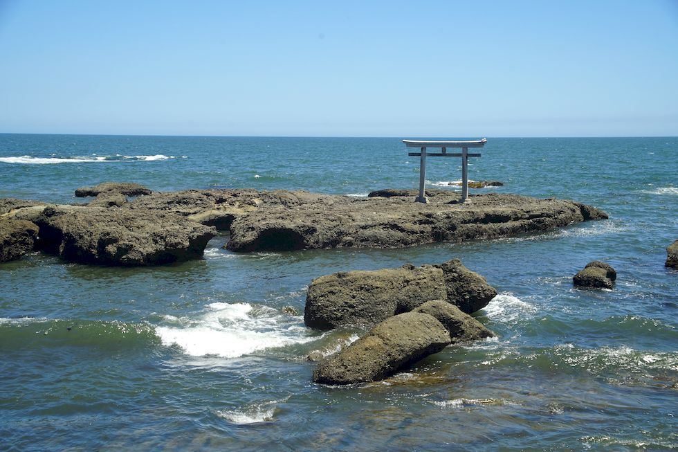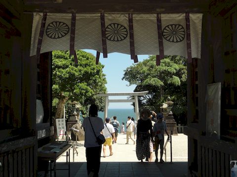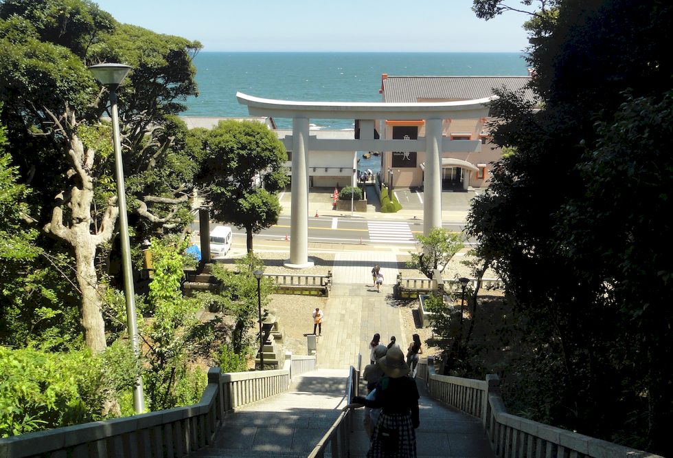大洗磯前神社へ大洗駅から町内の観光ルート循環バス(100円)で大洗磯前神社へ。まずは海岸へ出て岩場にある鳥居をみる。 あまり海は荒れていないので白い波しぶきは少な目。急な階段を上った丘の上に神社がある。階段の上から磯の鳥居は 見えないのが残念。 |