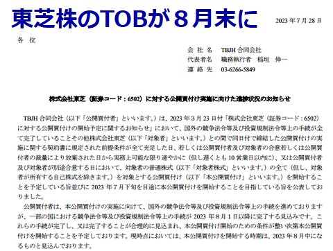 東芝TOBは8月末に延期?当初は7月末としていたTOB実施だが知らないうちに8月末予定に変更、信用ならない? |