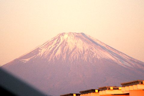 朝の富士山赤っぽいのは夜明け時の太陽の赤い光を受けたもの。 |