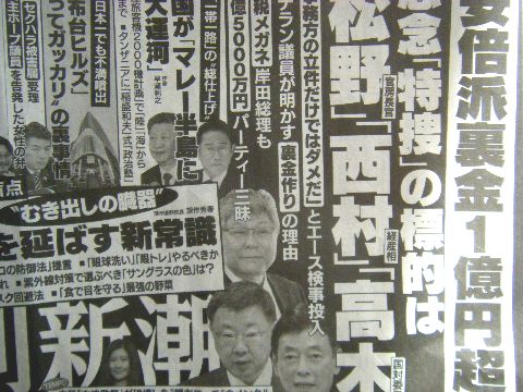 自民党のパーティ裏金疑惑が露見しそうアベは検察を人事権で脅して自分たちのインチキや不正が露見しないように立ち回っていたが、岸田になって そんな便法はなく。アベに痛い目に遭わされた検察の意気込みに期待、もうアベ派の関係者の任意聴取は始まって いるようなので期待。 |