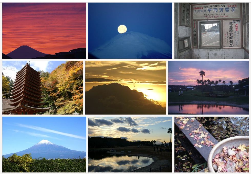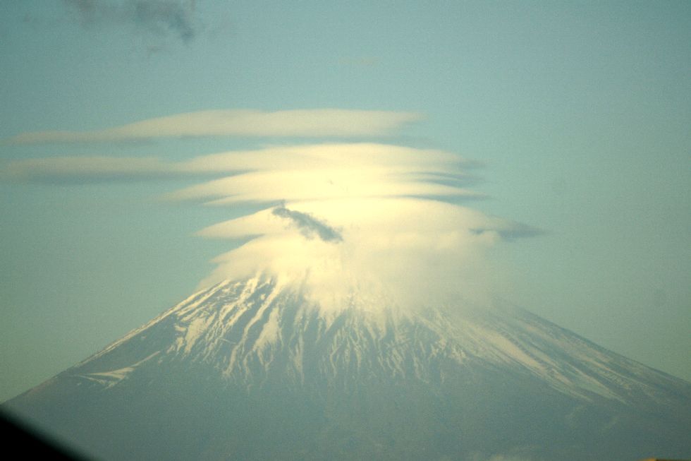 傘雲が重なった富士山朝は傘雲が何重も重なってかかる不思議な風景、しばらくすると傘が崩ればらばらに。そのうちに雲自体が消えて 普通の風景になった。 |