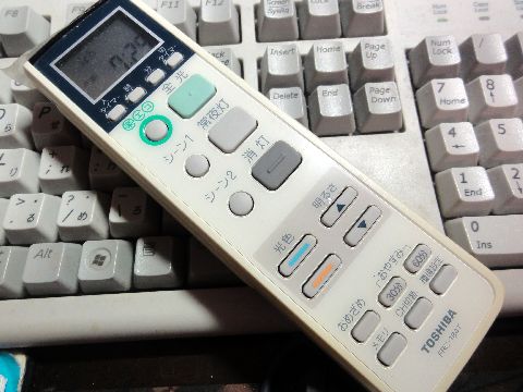 リモコンだらけこれはLEDが部分故障の天井用LED照明器具のもの、結構高価だったのでタイマ機能付の立派なリモコン。 でも電池が単3か単4(最近はこちらが主流)なので電池ばかり必要で困ったもの。単4は秋葉原で10本100円の もの(フラッシュ付使い捨てカメラからの再利用品)を買ってあるので大丈夫だが。 |