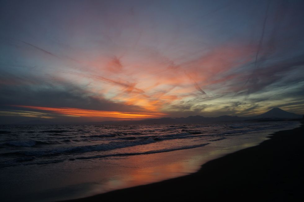 辻堂海岸の夕景:赤く染まる空と富士山
