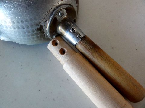 鍋の交換用把手が届いたが直径が大きすぎで相当削らないといけないので、他の方法で修理することにして購入した把手はキープ。 パテでやせた把手を太くしぐらつかないようにして2本のネジで留めて対策。他の3個の鍋も緩みを修理。 |