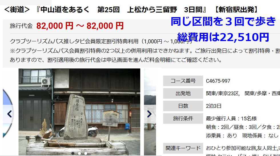 旧中山道歩きの費用について一番楽なのはクラブツーリズムのツアーに参加すること、でも100万円近いお金が掛かるうえに付いてゆくだけの旅に なり、自分で道も調べて歩くのとは大違い。もちろん費用の差は莫大、この例では3日間のコースだが3回に分けて歩いても 宿泊費を含めて1/3以下、もちろん青春18きっぷを利用し普通列車で移動するなどの工夫と忍耐力は必須だけども。 |