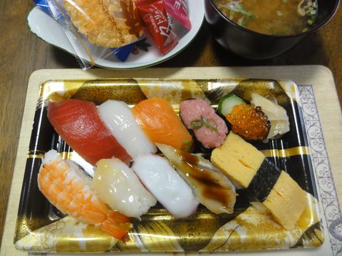 昼はお寿司、夜はすきやでお昼は早めにOKへお寿司を買いに行って食べた。午後は雨模様だったが夕方には上がり、夕食は近所の数寄屋へ、散歩がてら出掛けた。 |