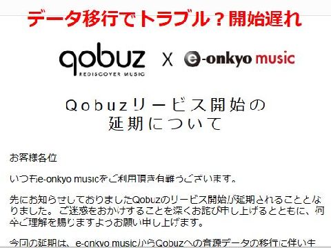 QUOBOZ、トラブルでスタートできずONKYO-MUSICと統合した(QUOBOZによる買収)が新サービスはトラブルでスタートできないよう。ONKYOサイドのデータを変換し 新たなサイトへ移すのが技術的?トラブルでうまくいかないらしい。 |