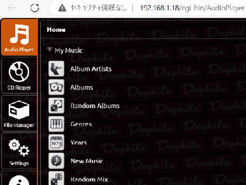 Daphileが繋がらない:原因判明原因不明のうちに勝手に?復旧することもあったが、また接続不能に。色々調べて、どうやらメインPCのアドレスが動的に 決まるので(デフォルト)、先にDaphileのアドレスを使ってしまうのが原因だとやっと判明。とりあえずDaphile側の固定アドレス 設定を変えて対策。メインPCのアドレスも固定するべき?かという疑問が残る。 |