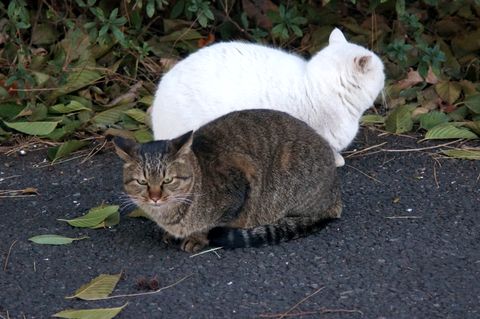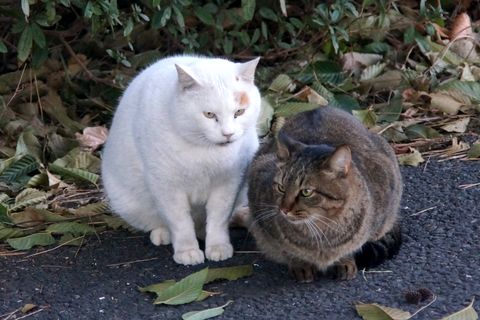 公園の「地域猫」、逃げない公園内では「餌をやらない」よう注意書きもあるが、おばはんのグループが定期的にえさ遣りをしている。 |