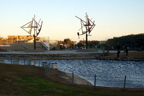 強風で海岸遊歩道は到底歩けない強い西風で白波が立って砂が飛ぶので到底歩くのは無理そう、公園内の道を歩いて代わりに。池の水も強風で波立っている。 |