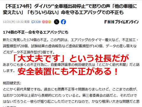安全装置でも不正、これで安心して乗れる?今やトヨタの完全子会社であるダイハツ、日野自動車に続き不正が露呈したが「トヨタの押し付け」が根本 原因でないかと。ダイハツの実態を見ないままトヨタ式を押し付けているというのは危惧?今回の不正発覚の 記者会見にトヨタ社長・会長の姿は無く。 |
