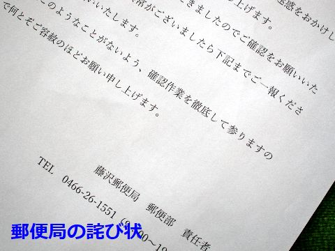 郵便局の誤配達発生メルカリのポイントが失効するとのことで、勿体ないので送料込みで丁度の額のPLフィルタを落札、なんと届いたのは 子供服、直ぐに出品者へ連絡するも「郵便局での取り違え」らしい、と回答有り。20日夜に郵便局の責任者(課長)が誤配 の荷物を引き取りに来た、原因は局での配達用伝票(住所あるもの)の貼り違えだという。 |
