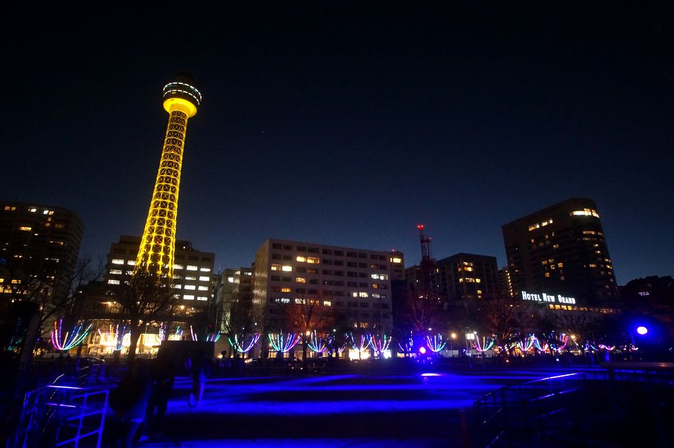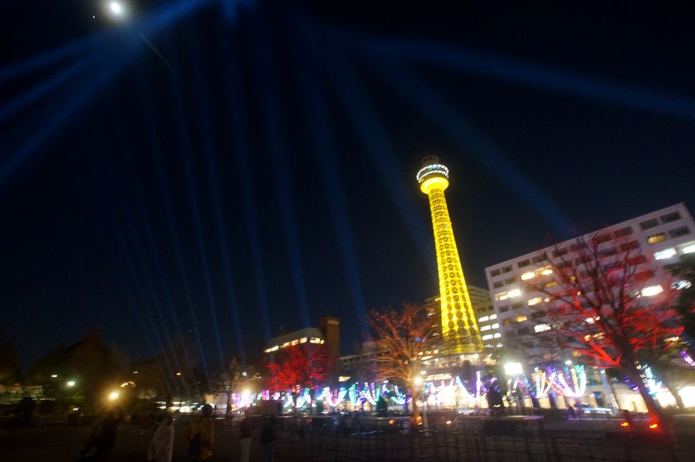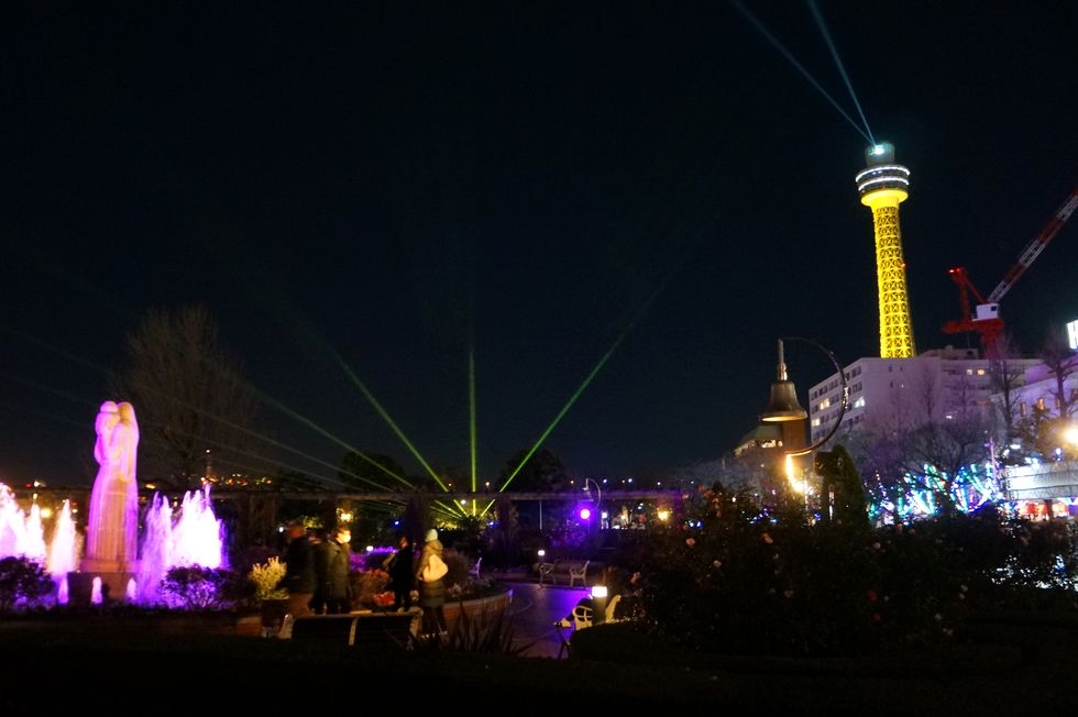 よこはまイルミ2023@山下公園投光器が音楽に合わせて色を変え投射方向を替えて動くという豪華な演出。マリンタワーも金色に輝きお金の掛かった イルミネーションイベント、さすがに横浜市は金持ち。 |
