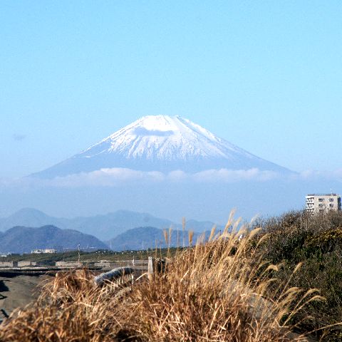 新蒲原駅から徒歩で40分ほど最寄り駅の新蒲原駅から歩いて行ったが解りやすい道、堤防手前には河川敷の滑走路で使うだろう機材倉庫もあった。 階段で展望に登ると富士山が綺麗に見えた。 |