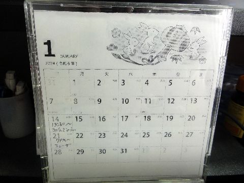カレンダや予定表も準備今年こそ朝日生命のデスクカレンダは来ないようなのでCDケース式を印刷して作成(去年は来ないと思っていたら来たが)。 |