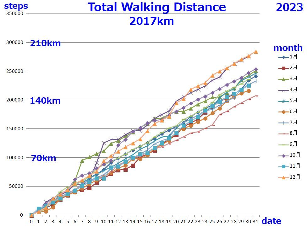 今年も頑張って歩いた:累計距離は2017kmとなった歩いた距離は体調の良さとも関係すると思える、11月は低調。天気はあんまり関係ないよう(小雨なら傘を差してでも歩くから)。