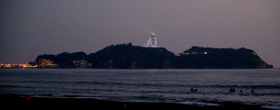 江の島の夕景:イルミネーション今年から光源が電球からLEDに変わったようで従来の煌めきは見られなくなり残念、省エネのためとはいえショボい感じ。