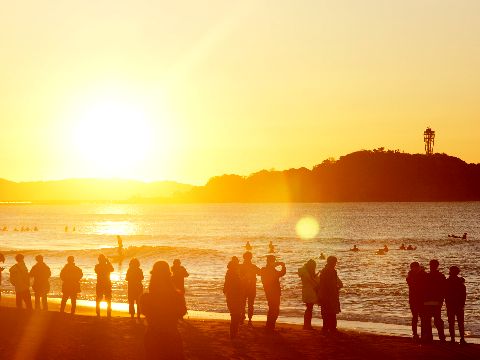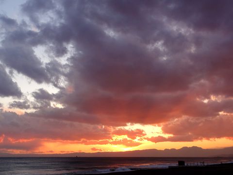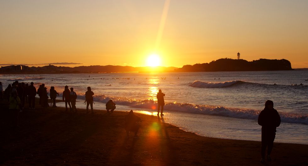 初日の出辻堂海岸から三浦半島から登る太陽を見る「初日の出」、好天で多数の人が海岸に来て混雑。でも海岸線は 長いので雑踏にはならないけど。