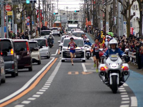 箱根駅伝(復路8区):青学がだんとつトップここまで繰り上げスタートはなし、一斉スタートのチームも含め15分程で通過。 |
