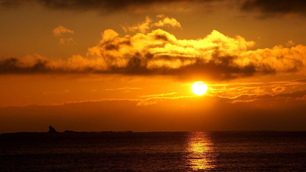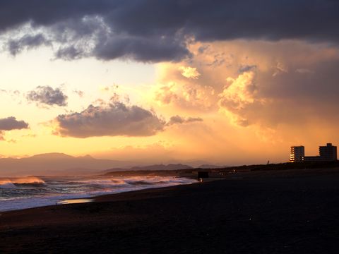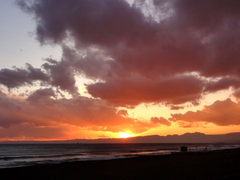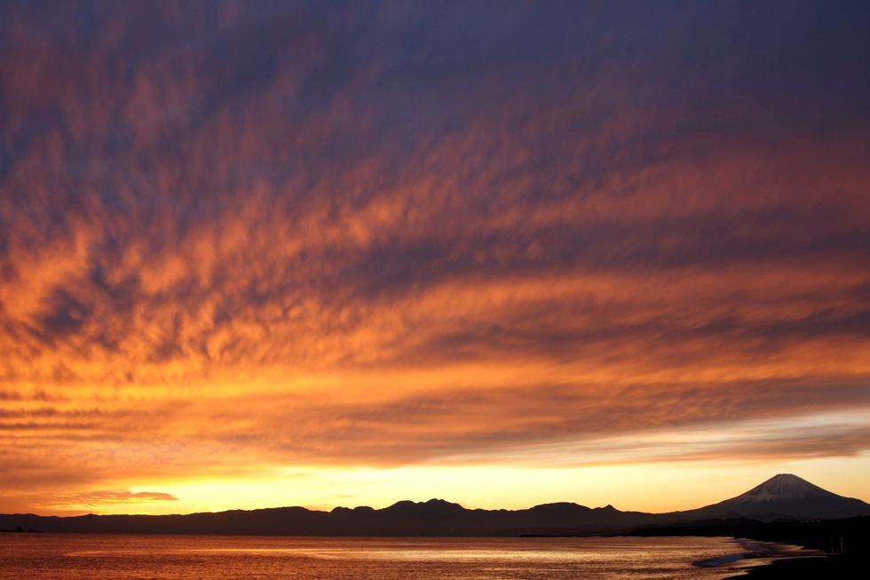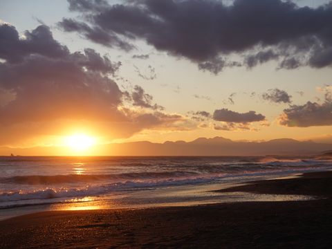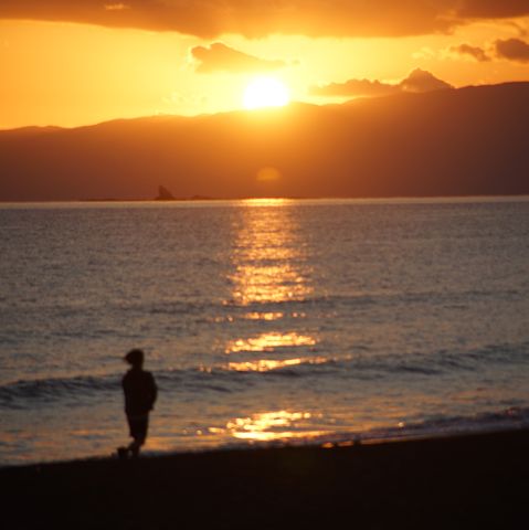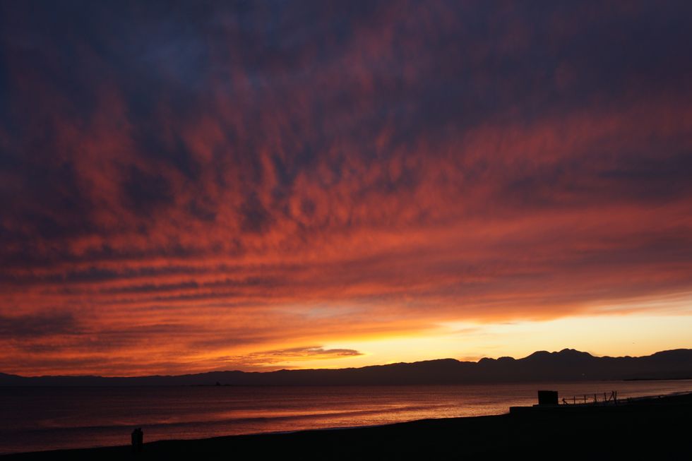 穏やかな夕暮れの海岸昼頃の雨も上がってほとんど風もなく穏やかな海岸からの日没風景、この後の羽田事故など思いもせず。