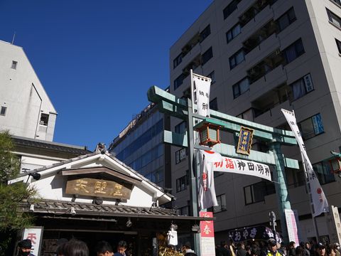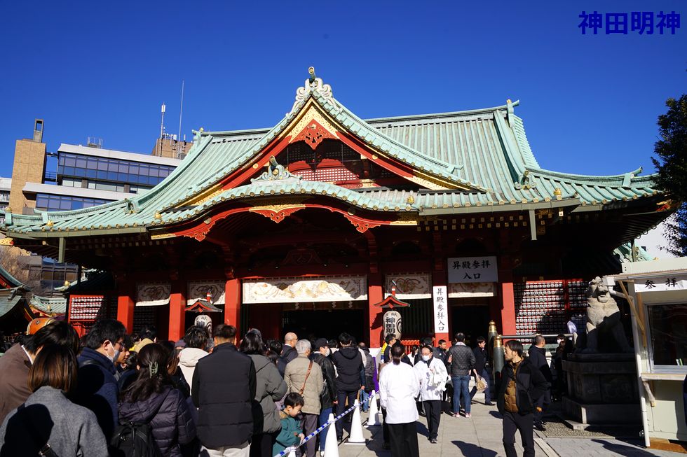 参拝客があふれて車道に列秋葉原から歩いて男坂の階段を上って神田明神へ、参拝の為の行列は車道にまで延びていてかかる時間は想像つかない。 |