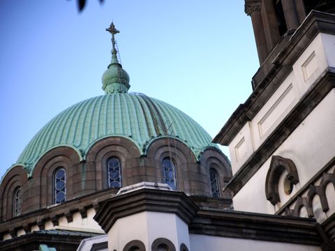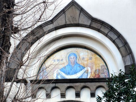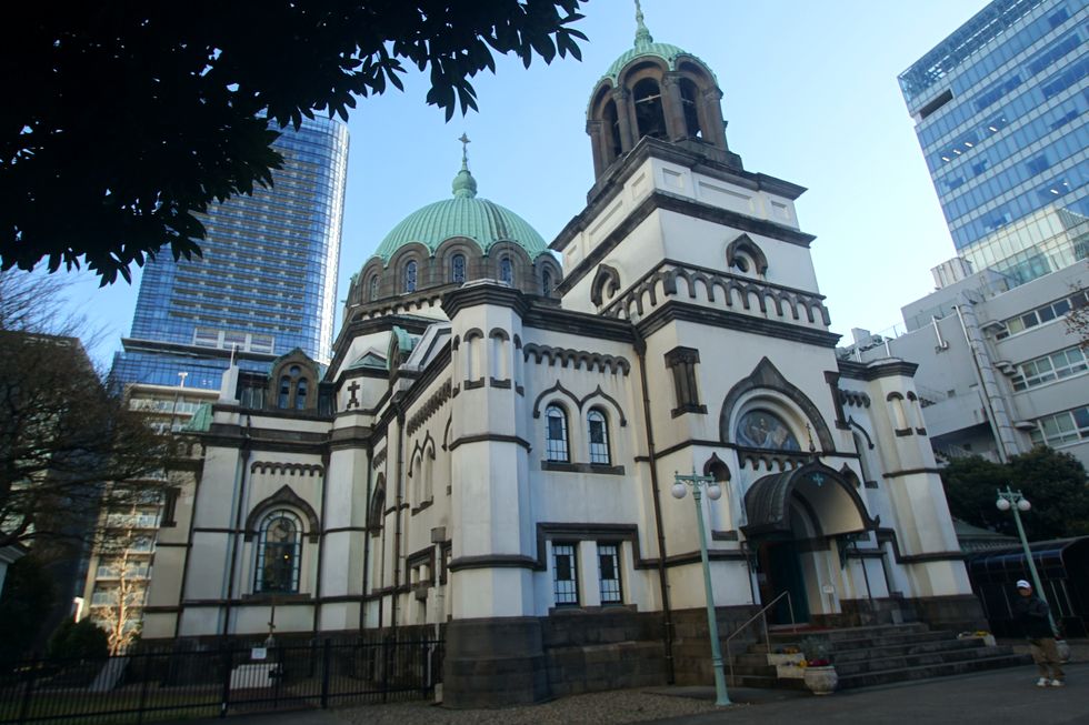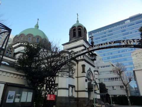 御茶ノ水のニコライ堂へ横は通るのだが門が閉まって入ったことのなかったニコライ堂、一般観覧は午後1時からというので 行ってみた。入口のキリル語の書かれた門をくぐり中へ。 |