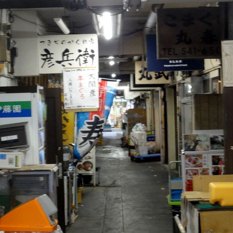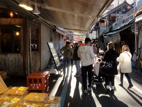初めて築地場外市場へここはIHIの仕事をしていた頃から良く通ったが場外市場へ行ったことはなかった。 狭い路地に幅の狭い店が密集するという昔ながらの市場のつくり。 |