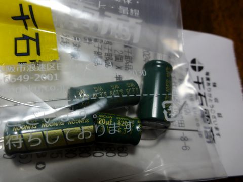 千石電商で電解コン4個を購入まずは目的の電解コンデンサ、秋月電子には6.3V耐圧品は無いので千石電商で購入、4個で280円(税込み)。 |