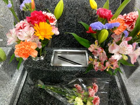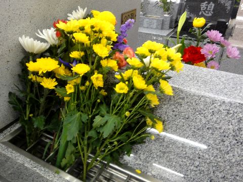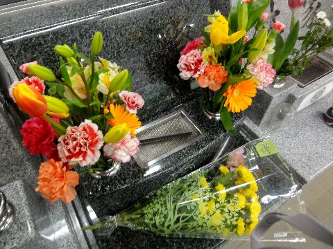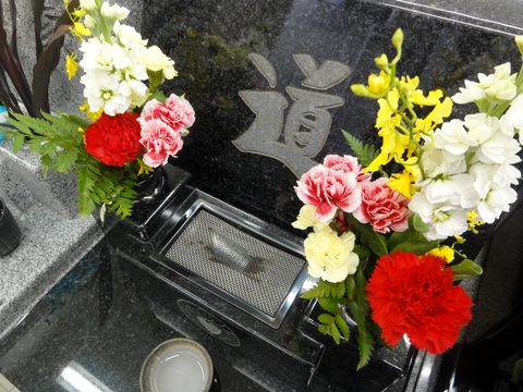 今年初の墓参りにどこの墓にも花があるというお正月明けの様子、寒さで花は長持ち。カーネーションは特に長くもつ、一部は 地下2階の義父母の墓へ。 |