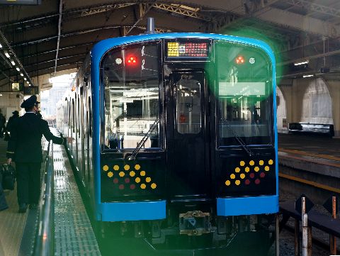 鶴見線の新車両:E131系103系車両の置き換えようとして投入、全部置き換え後はワンマン化が見えている。貫通扉があるように見えるが 実際はダミーで車内側には機器が並んでいるそう。 |
