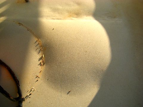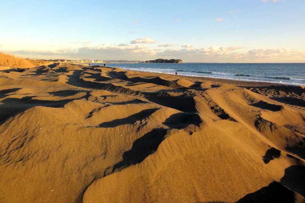 まるでグランドキャニオンみたいな光景海岸遊歩道に強風で溜まった砂を除去した山なのだが、低めの夕日を浴びて凹凸が強調され渓谷のような風景に 見える。 |