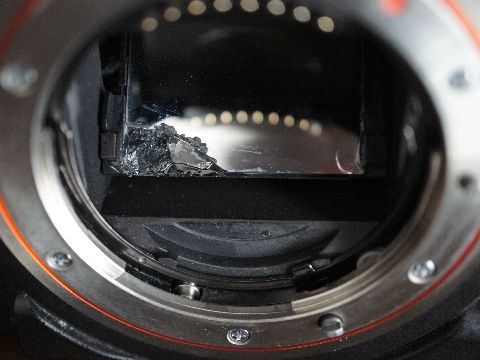 要修理:α900ミラー落ちミラー脱落でSONYに言うも無償修理とは言わない対応にガッカリ、自分で接着剤で再固定、また落ちて割れたので 再度固定、3回目は小さな角が脱落、欠片はカメラ内で見つからず、どこへ行った? |