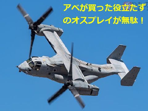 災害に役立たずのオスプレイアベが高額で購入したオスプレイ(他に買った国は無い)は欠陥の疑い多発で飛行停止中、更には搭載荷物や搭乗可能人員が 少なく災害救助には全く不向き、こんなゴミを買ったバカはアベ。 |