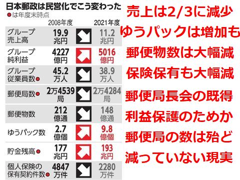 「郵便局長会」という改革を阻む団体こんなに郵便物が減っているのに小さな郵便局は殆ど減らない、これでは値上げしてもまた赤字は必至。 カンポでの高齢者騙し詐欺や消えた郵便貯金などで顰蹙をかったのはまだ記憶に新しい。 |
