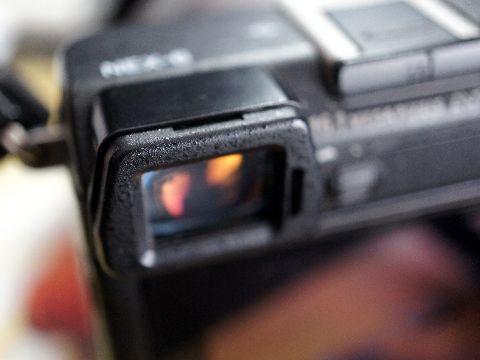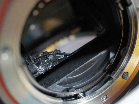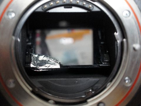 割れたミラーの修理?ミラー割れの痛々しいα900の様子、残ったミラーの一部は蒸着が剥がれてきている。 少しでもファインダを覗いた際の感じを良くするためアルミテープを貼り対策、ファインダを覗くと左上部が ぼやっと白く見え、以前の真っ黒よりはマシか。 |